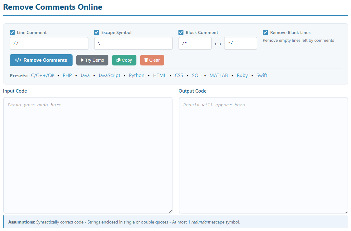 The Remove Comments Online tool is a powerful, general-purpose utility designed to automatically remove comments from source code in almost any programming or markup language. Whether you're working with C++, JavaScript, Python, HTML, CSS, Java, PHP, Ruby, SQL, MATLAB, or Swift, this tool intelligently identifies and removes both line comments and block comments while preserving the integrity of your code.