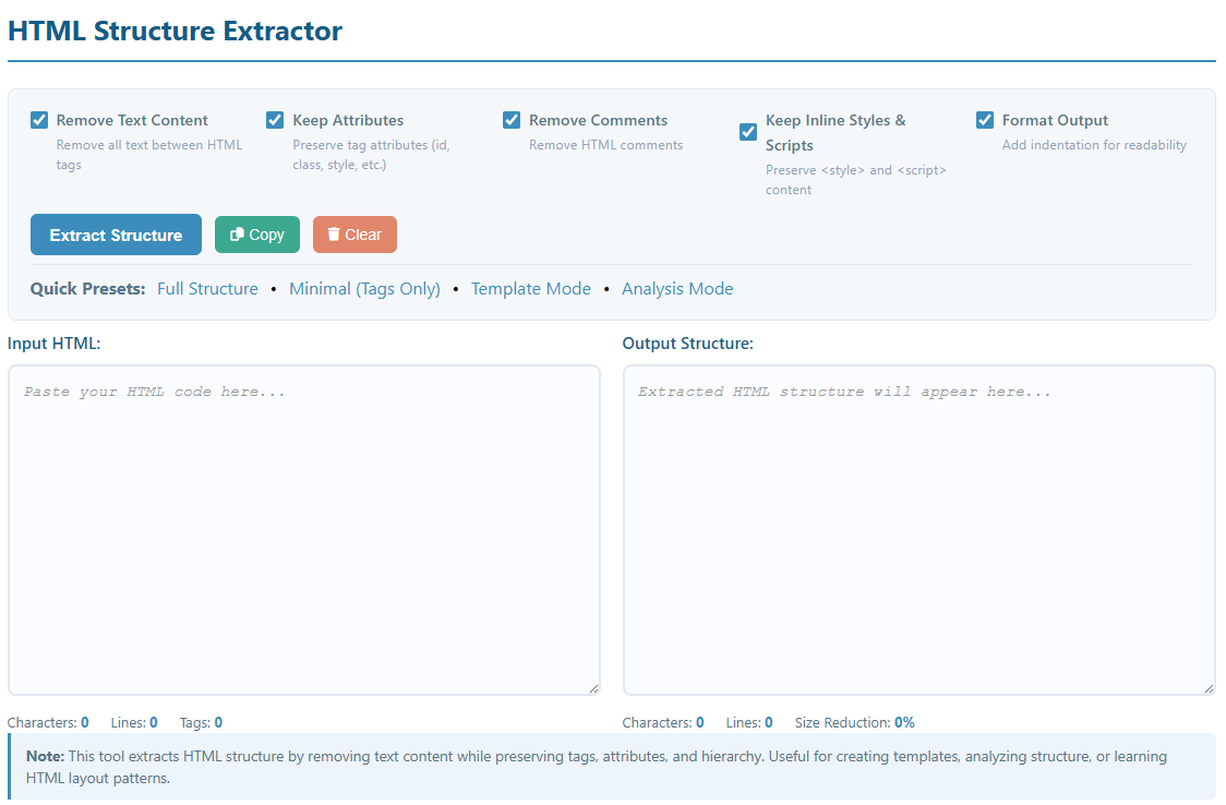 The HTML Structure Extractor is a powerful tool designed to isolate and extract the structural skeleton of HTML documents. By removing text content while preserving all HTML tags, attributes, and hierarchy, this tool helps developers, designers, and SEO specialists analyze page structure, create templates, and understand HTML layouts without the distraction of content.