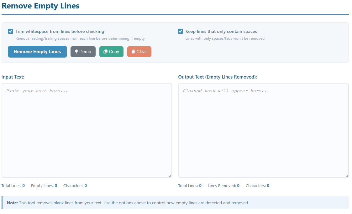 - Try Demo: Click the "Demo" button to load sample text with empty lines.