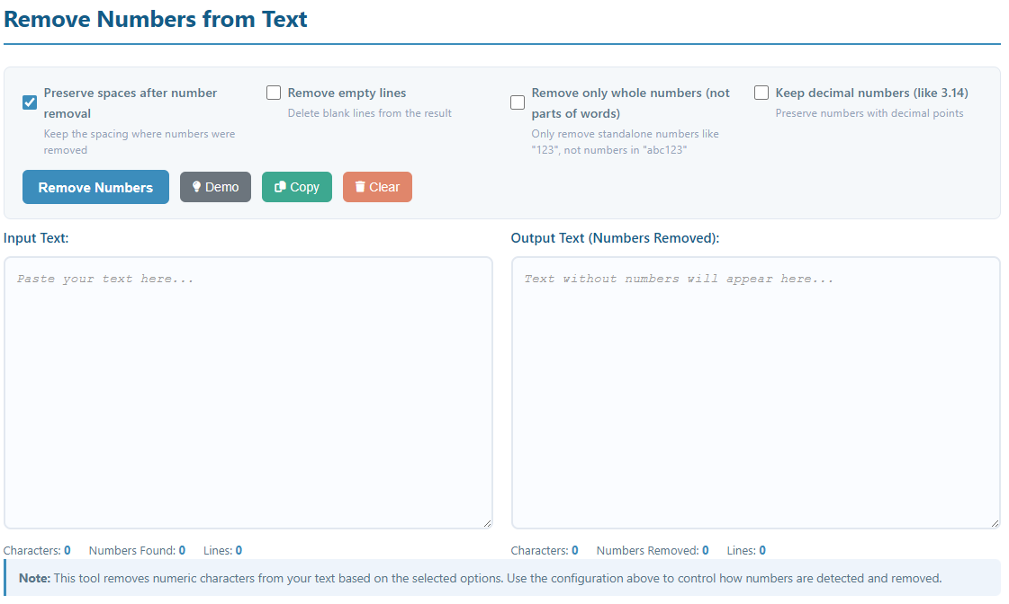 The Remove Numbers from Text tool helps you strip numeric characters from any text content. Whether you need to clean up data, remove reference numbers, or extract non-numeric content, this tool provides flexible options to match your needs.