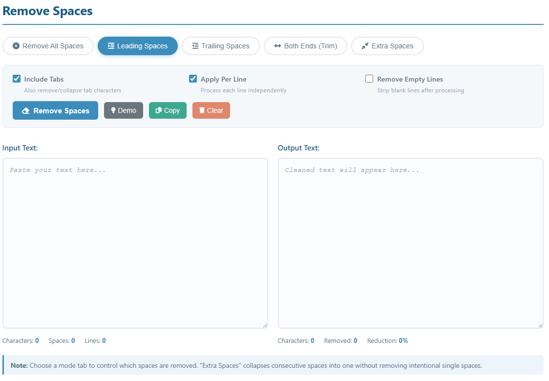 - Leading Spaces — remove indentation/spaces at the start of each line